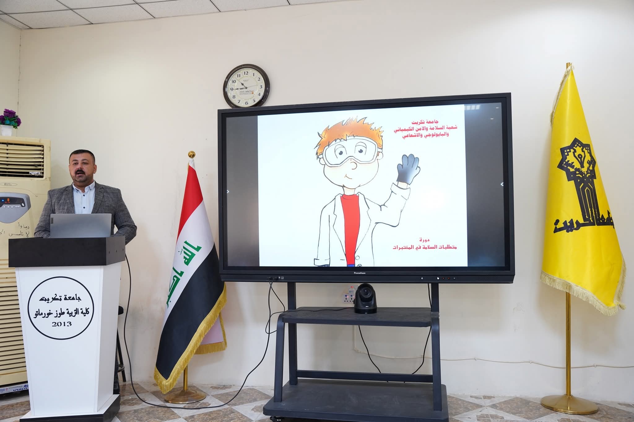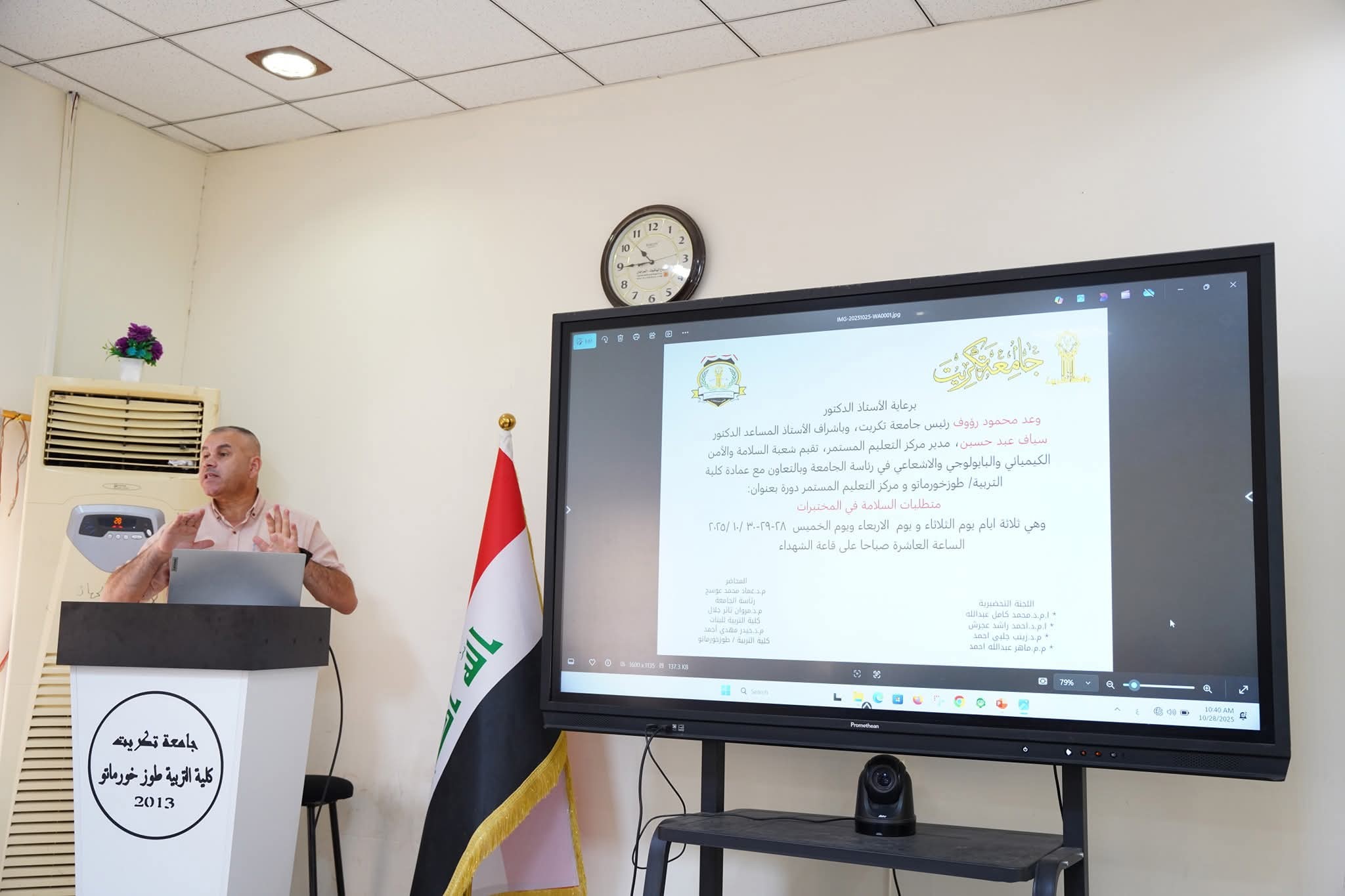 The course is being held in collaboration between the Division of Chemical and Radiological Safety and Security, the University Presidency, the College Deanship, the Tuz Civil Defense Department, and the Continuous Education Center. It will run for three days in the Martyrs' Hall at the College of Education in Tuz Khurmatu.