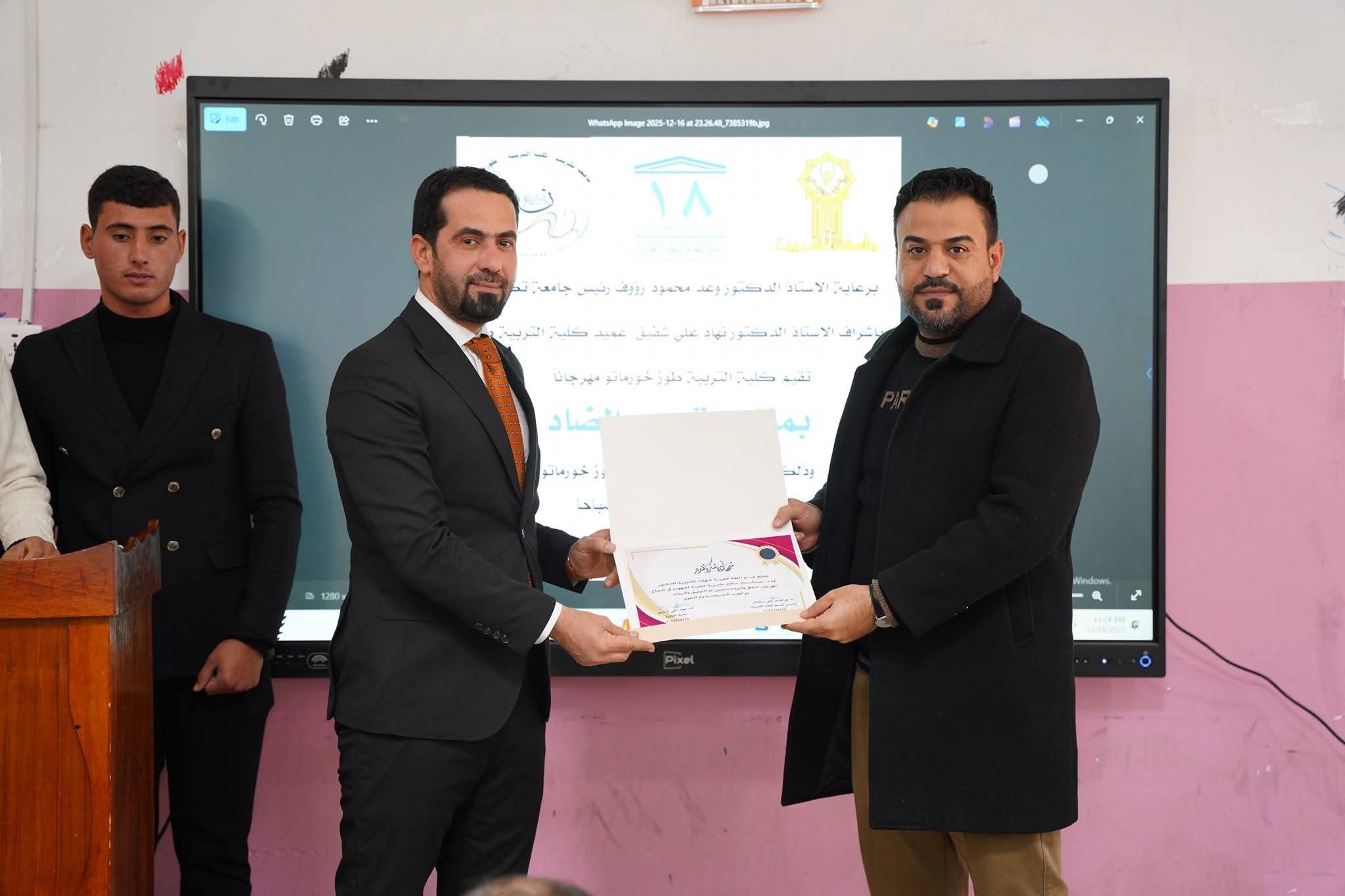 Under the auspices of the President of Tikrit University, Professor Dr. Waad Mahmoud Raouf, and under the supervision of the Dean of the College of Education/Tooz Khurmato, Professor Dr. Nihad Ali Shafiq, the College of Education/Tooz Khurmato held its cultural festival on Thursday, December 18, 2025, in celebration of World Arabic Language Day (Dhad Day) on the college campus. The festival was attended by the Administrative Assistant Dean, Dr. Ibrahim Saleh Ahmed, the Scientific Assistant Dean, Professor Ali Salah Zein Al-Abidin, and a gathering of faculty members and students, with organization led by the Department of Arabic Language. The program commenced with a recitation from the Holy Quran followed by the national anthem, and included a speech by the Head of the Arabic Language Department, Dr. Ibrahim Ali Salman, highlighting the prestige and significance of the Arabic language. The event further featured a theatrical performance of the "Zunburiyya Issue," a poetic debate among students, and the recitation of poems honoring the Arabic language. The festival concluded with the distribution of certificates of appreciation to the organizers in recognition of their efforts in ensuring the success of the event.